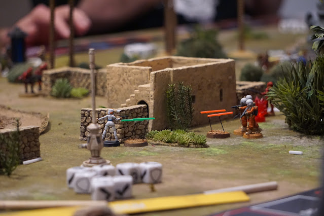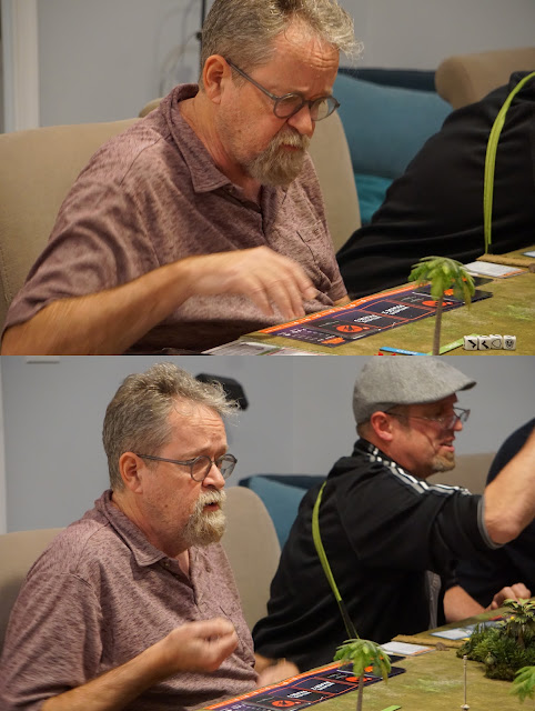 Zeb, Peter, and I played a combination of the planet's native inhabitants and the Astroguards deployed by the Union of Sovereign Star Systems, with a slate of objectives we could choose to pursue that ranged from protecting key features on the battlefield to claiming the bounty on some of the shady characters amongst our opponent's units. Our opponents played a gang of pirates and other intergalactic ne'er-do-wells who have landed on the planet with a variety of objectives that typically involved plundering precious resources or kidnapping diplomats stationed to the planet.